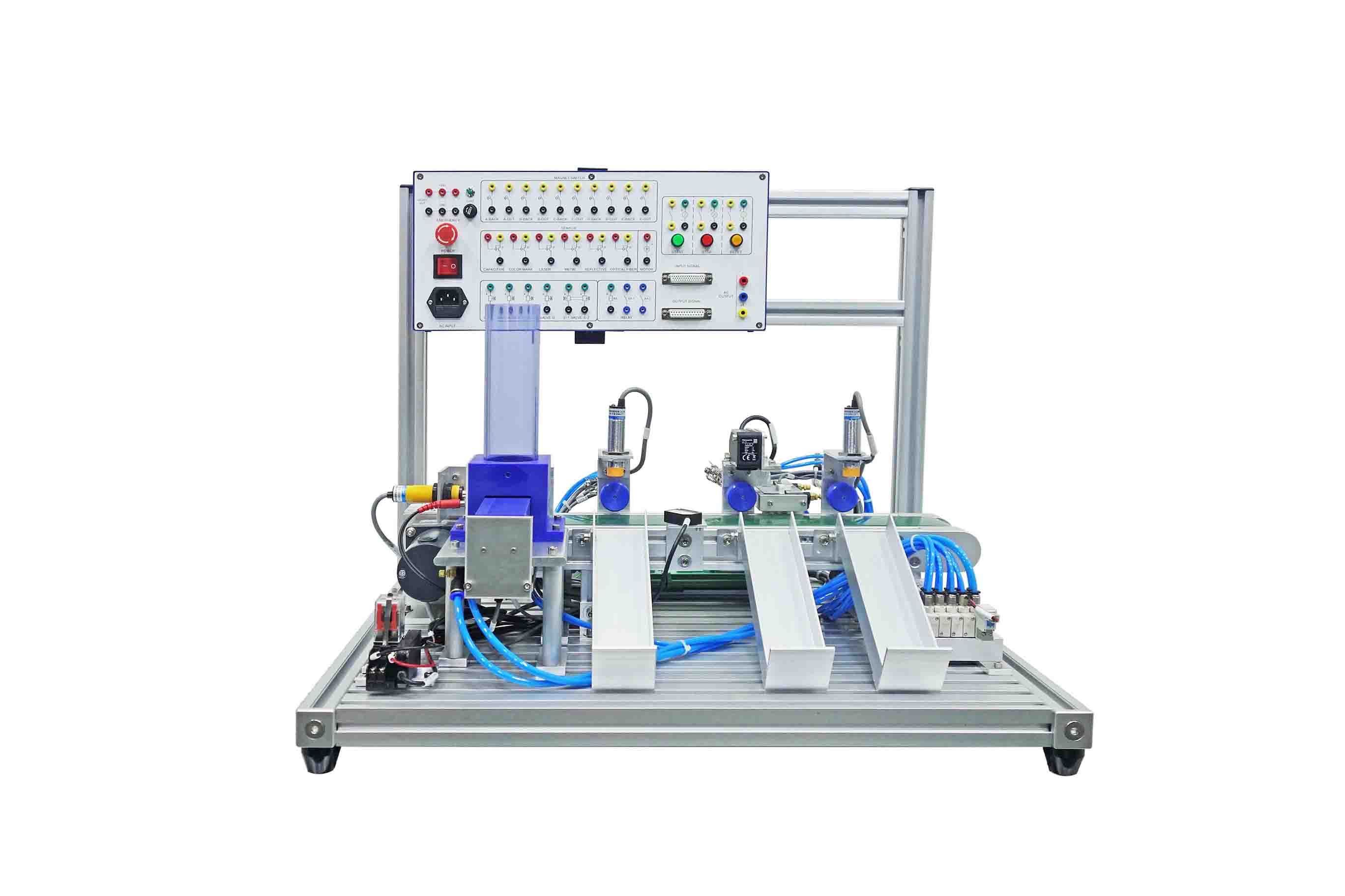 Integrazione Completa: Comprende tutte le componenti essenziali per simulare un sistema automatizzato, tra cui alimentazione, trasferimento, ordinamento e controllo elettrico.