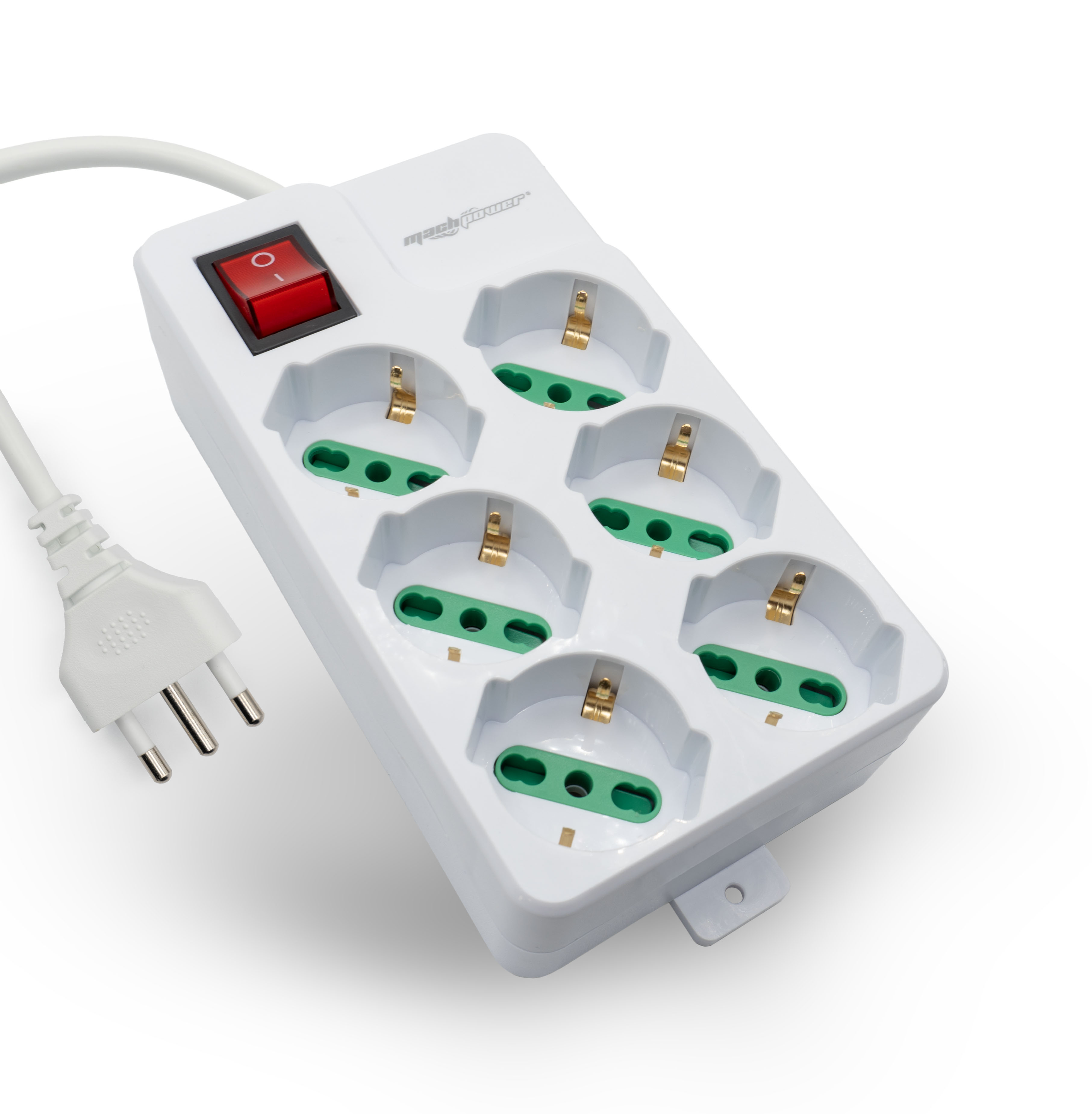 La multipresa con 6 ingressi universali Schuko/Bipasso è dotata di un interruttore generale luminoso per una gestione sicura ed efficiente dell'energia. La spina italiana 16A e la protezione contro il sovraccarico garantiscono sicurezza e affidabilità. Adatta per l'uso domestico e in ufficio, permette di collegare fino a 6 dispositivi contemporaneamente grazie alle sue prese angolate a 45°, che offrono maggiore flessibilità. È dotata di protezione per bambini e realizzata con cavo H05VV-F 3G1.0mm² di 1,5 metri di lunghezza, ideale per supportare fino a 3500W di potenza. Il colore bianco e il design compatto con occhielli di fissaggio permettono un'installazione ordinata e sicura in qualsiasi ambiente.